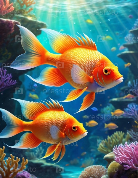 Яркие оранжево-бело-желто-синие-красные рифовые рыбы плавают через коралловый риф. Солнечные лучи проникают в морскую воду. Разнообразие животных. Экология гидросферы. Антропогенный фактор, влияющий на гибель коралловых рифов. AI
