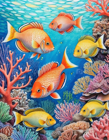 Яркие оранжево-бело-желто-синие-красные рифовые рыбы плавают через коралловый риф. Солнечные лучи проникают в морскую воду. Разнообразие животных. Экология гидросферы. Антропогенный фактор, влияющий на гибель коралловых рифов. AI