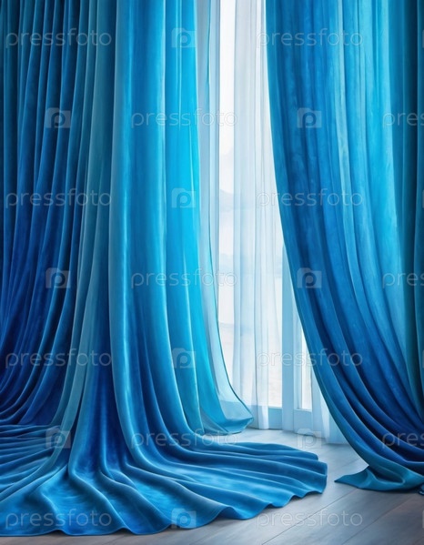 Занавес с мягкими плавными стекающими складками. Глубокий синий цвет и роскошная текстура создают драматическую и элегантную атмосферу. Декорация и дизайн интерьера. Дорогая занавес из богатой ткани. AI