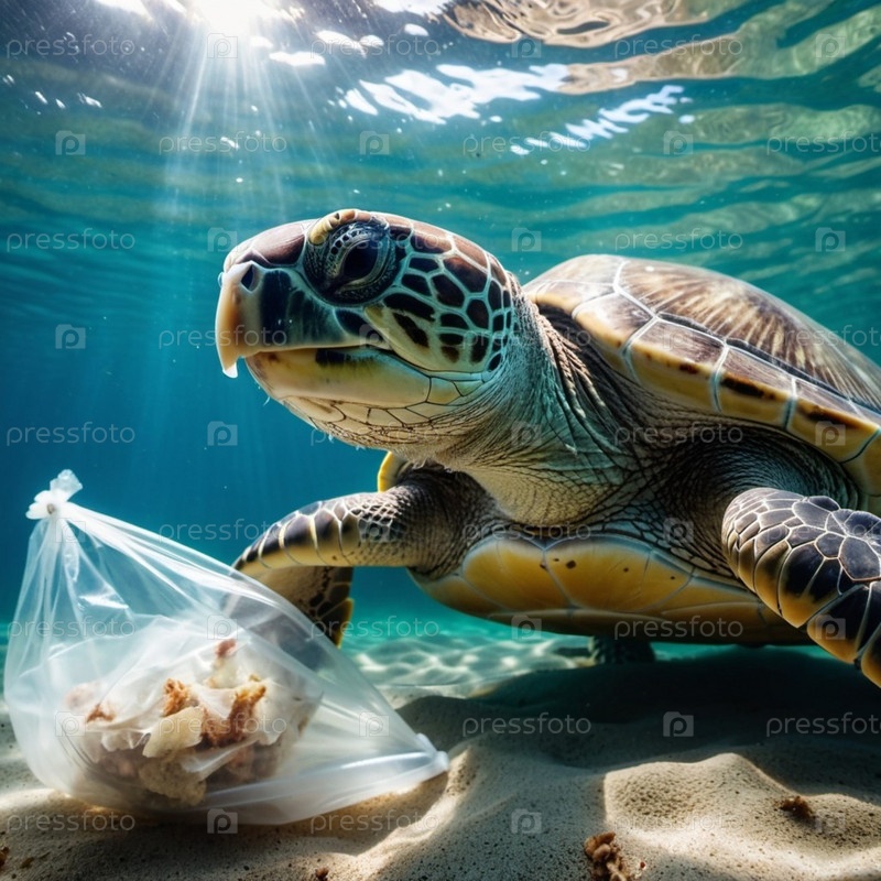 Морская черепаха поймана в пластиковый пакет на песчаном пляже около океана. Ее тело лежит на песке. Изображение подчеркивает опасность пластикового загрязнения океана и необходимость защиты окружающей среды. Создано с помощью ИИ