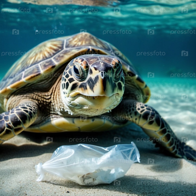 Морская черепаха поймана в пластиковый пакет на песчаном пляже около океана. Ее тело лежит на песке. Изображение подчеркивает опасность пластикового загрязнения океана и необходимость защиты окружающей среды. Создано с помощью ИИ