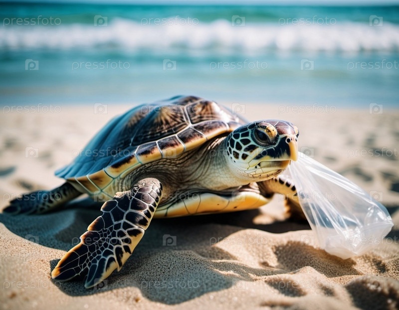 Морская черепаха поймана в пластиковый пакет на песчаном пляже около океана. Ее тело лежит на песке. Изображение подчеркивает опасность пластикового загрязнения океана и необходимость защиты окружающей среды. Создано с помощью ИИ