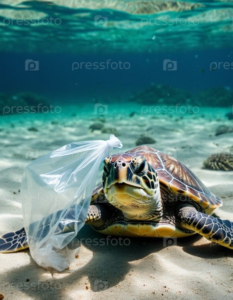 Морская черепаха поймана в пластиковый пакет на песчаном пляже около океана. Ее тело лежит на песке. Изображение подчеркивает опасность пластикового загрязнения океана и необходимость защиты окружающей среды. Создано с помощью ИИ