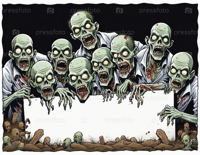 Большая группа зомби, чьи лица искажены выражением голода и разложения, держат пустой знак, их бледная, разлагающаяся кожа и пятна крови видны. Мертвые восстают на кладбище ночью. ИИ
