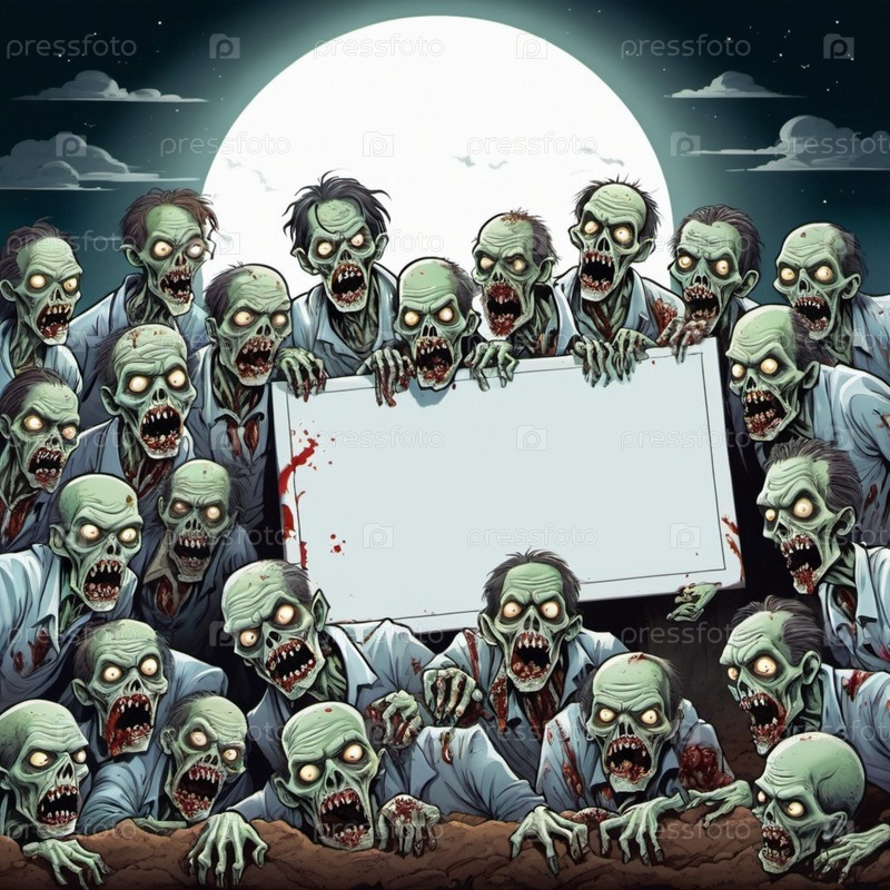 Большая группа зомби, чьи лица искажены выражением голода и разложения, держат пустой знак, их бледная, разлагающаяся кожа и пятна крови видны. Мертвые восстают на кладбище ночью. ИИ