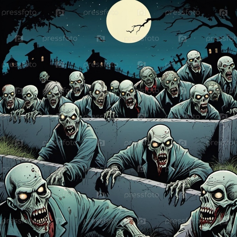 Ужасные комичные зомби появляются из могил, разложившиеся тела освещаются лунным светом. Скелетные фигуры бродят среди надгробий, в то время как другие ползают по земле, демонстрируя свой ужасный вид. ИИ