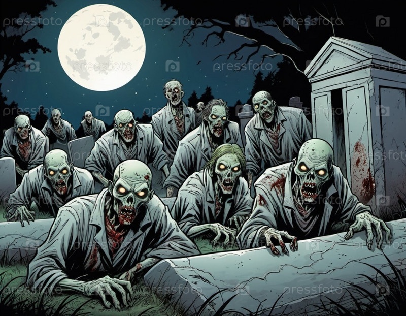 Ужасные комичные зомби появляются из могил, разложившиеся тела освещаются лунным светом. Скелетные фигуры бродят среди надгробий, в то время как другие ползают по земле, демонстрируя свой ужасный вид. ИИ