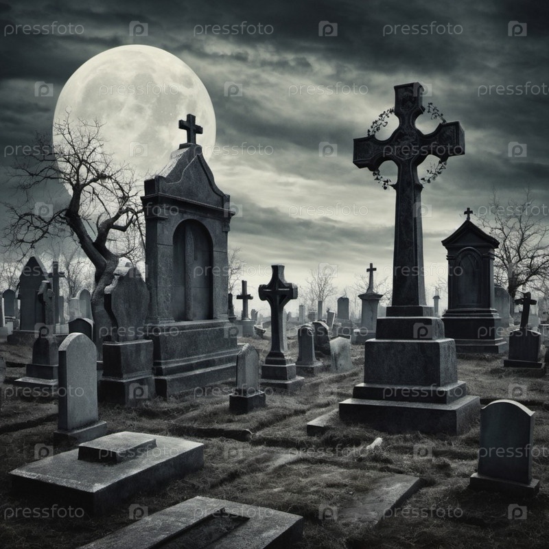 Спокойное кладбище. Торжественная атмосфера. Приглушенный светлый пейзаж. Темные облака. Драматический фон. Изысканные надгробия и кресты стоят как часовые среди могильных плит. Созерцание и воспоминание