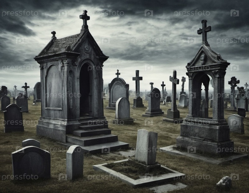 Спокойное кладбище. Торжественная атмосфера. Приглушенный светлый пейзаж. Темные облака. Драматический фон. Изысканные надгробия и кресты стоят как часовые среди могильных плит. Созерцание и воспоминание
