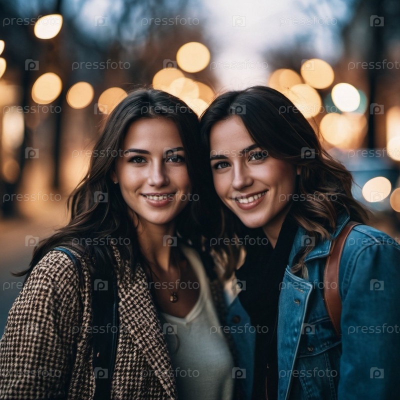 Две девушки стоят близко друг к другу, обмениваясь радостными улыбками. Городская улица в сумерках. Расслабленные позы, радостные выражения отражают дружбу. Городская обстановка предполагает оживленный вечер, приключения и воспоминания