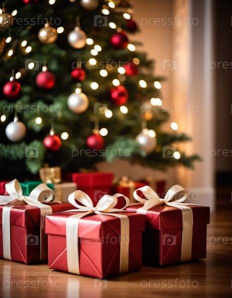 Уютная гостиная, украшенная праздничной рождественской елкой, украшенной сверкающими огнями и красочными безделушками, окруженная множеством тщательно упакованных подарочных коробок, ожидающих открытия. Искусство ИИ