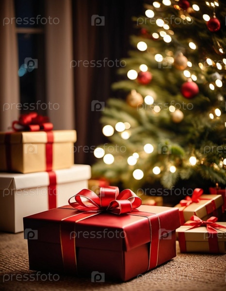 Уютная гостиная, украшенная праздничной рождественской елкой, украшенной сверкающими огнями и красочными безделушками, окруженная множеством тщательно упакованных подарочных коробок, ожидающих открытия. Искусство ИИ