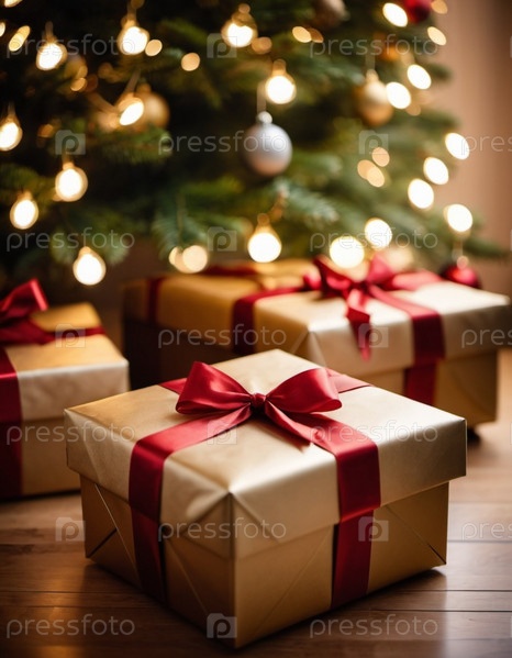 Уютная гостиная, украшенная праздничной рождественской елкой, украшенной сверкающими огнями и красочными безделушками, окруженная множеством тщательно упакованных подарочных коробок, ожидающих открытия. Искусство ИИ