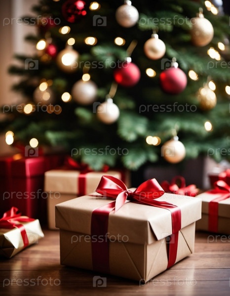Уютная гостиная, украшенная праздничной рождественской елкой, украшенной сверкающими огнями и красочными безделушками, окруженная множеством тщательно упакованных подарочных коробок, ожидающих открытия. Искусство ИИ