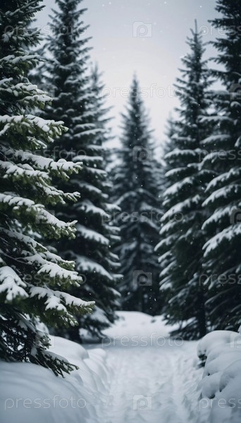Еловый лес покрыт толстым слоем снега, иней украшает ветви. Мягкие снежинки мягко падают, создавая спокойный и безмятежный зимний пейзаж среди деревьев