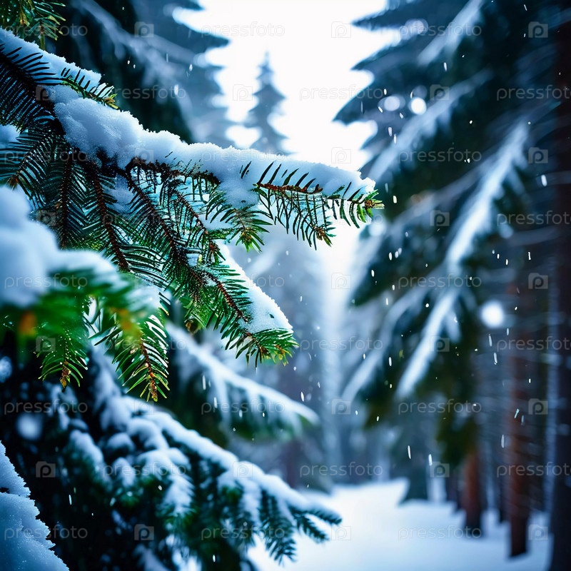 Безмятежный еловый лес, покрытый зимним снегом, демонстрирующий покрытые инеем деревья и мягкий снегопад, создающий спокойную атмосферу в мирной лесной обстановке. Генеративный ИИ