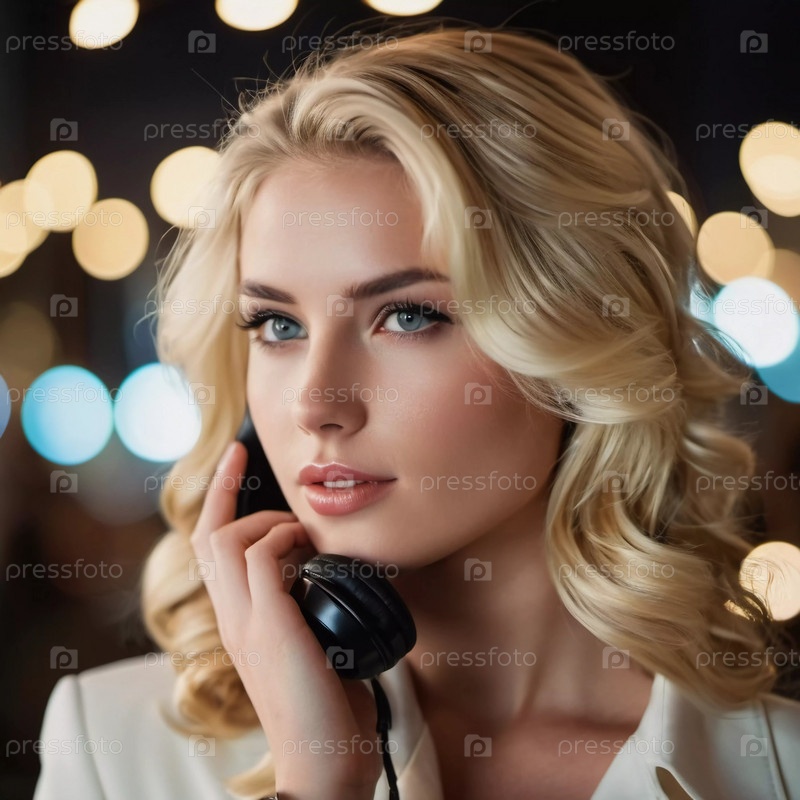 Молодая женщина со светлыми волосами разговаривает по телефону, элегантно одетая, в окружении теплого, сияющего света во время изысканного вечернего мероприятия