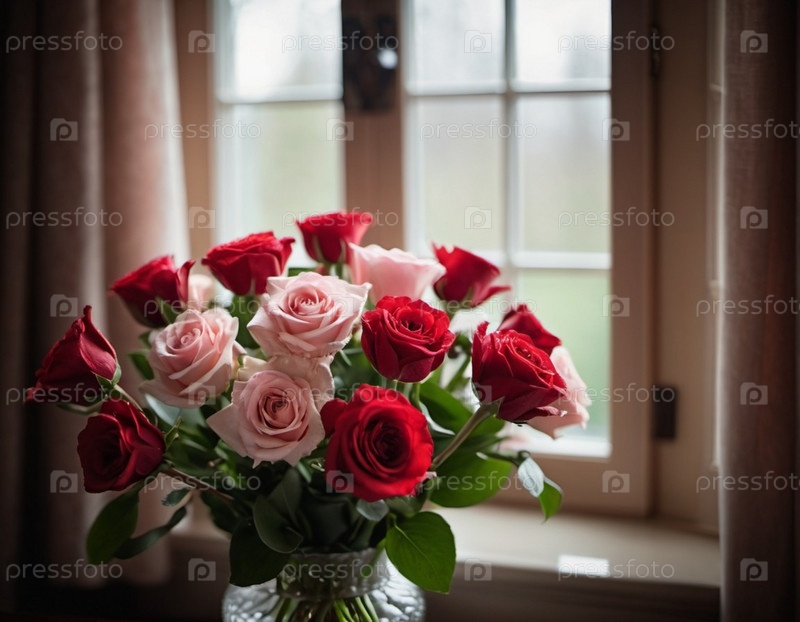 Прекрасный букет из красных и розовых роз изящно стоит в стеклянной вазе, символизируя привязанность и романтику. Он идеально подойдет для празднования Дня святого Валентина или в качестве душевного подарка