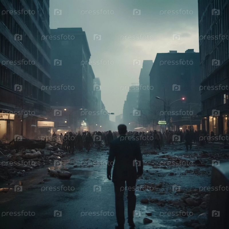 Городской пейзаж, опустошенный нашествием зомби в сумерках, одинокая фигура пробирается через обломки. Генеративный ИИ