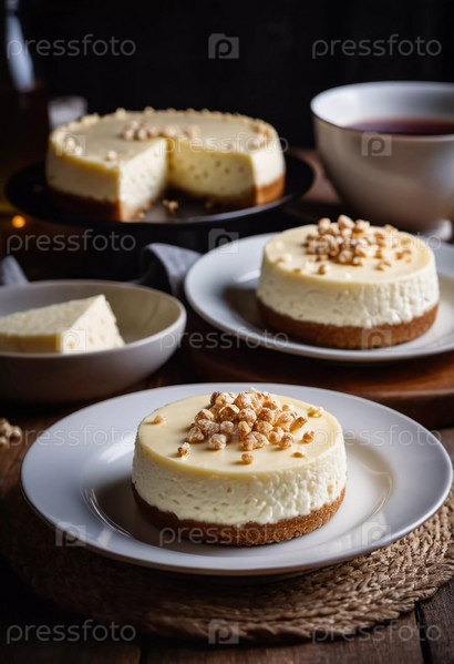 Побалуйте себя крупным планом кремовых творожных чизкейков, украшенных хрустящими орехами, которые элегантно подаются на белых тарелках рядом с теплой чашкой чая в деревенской обстановке кухни. Генеративный ИИ