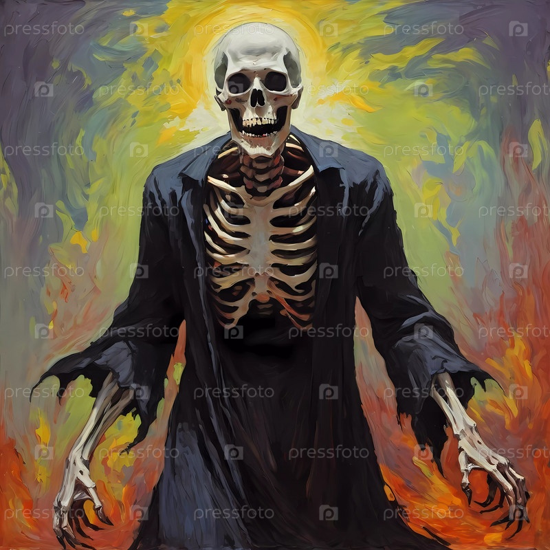 Появляется зловещая фигура со скелетной ухмылкой, окруженная огненными существами, готовыми к темному противостоянию. Генеративный ИИ