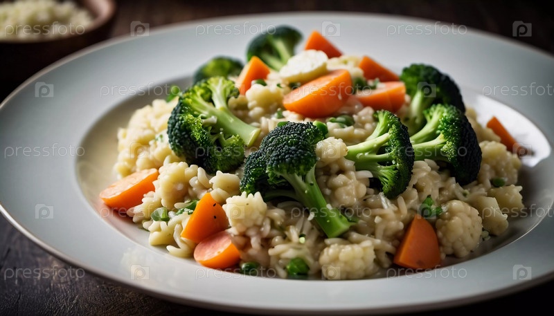 Сытное ризотто содержит яркие брокколи, цветную капусту и морковь, создавая красочное и питательное блюдо, идеально подходящее для любого приема пищи. Эта сытная еда демонстрирует полезные ингредиенты. Генеративный ИИ