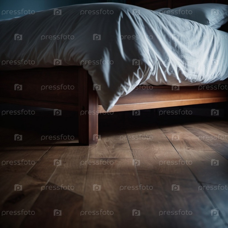 Деревянная кровать обрамляет спокойную спальню, украшенную мягким синим постельным бельем. Теплый вечерний свет мягко освещает полированный деревянный пол, создавая спокойную атмосферу. Генеративный ИИ. Страшная спальня