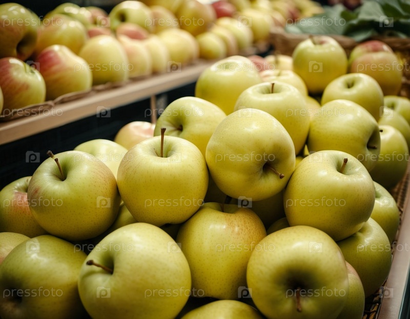 Разноцветный ассортимент желтых яблок аккуратно разложен на прилавке супермаркета, приглашая покупателей рассмотреть и выбрать свежие фрукты. Генеративный ИИ