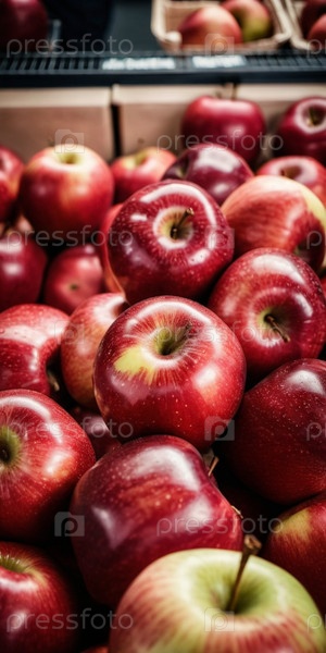 Разноцветный ассортимент красных яблок аккуратно разложен на прилавке супермаркета, приглашая покупателей рассмотреть и выбрать свежие фрукты. Генеративный ИИ