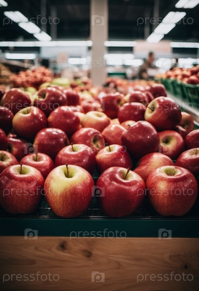 Разноцветный ассортимент красных яблок аккуратно разложен на прилавке супермаркета, приглашая покупателей рассмотреть и выбрать свежие фрукты. Генеративный ИИ