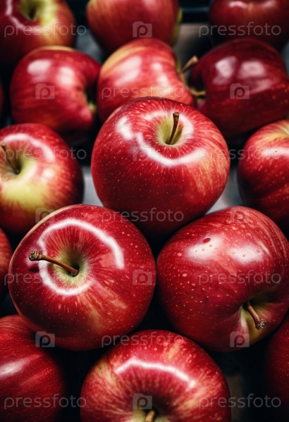 Разноцветный ассортимент красных яблок аккуратно разложен на прилавке супермаркета, приглашая покупателей рассмотреть и выбрать свежие фрукты. Генеративный ИИ