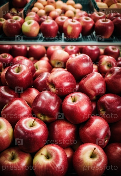 Разноцветный ассортимент красных яблок аккуратно разложен на прилавке супермаркета, приглашая покупателей рассмотреть и выбрать свежие фрукты. Генеративный ИИ