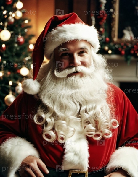 Санта воплощает дух праздника с радостной улыбкой, пушистой белой бородой и приветливым поведением, идеально передавая суть рождественского настроения среди праздничного декора. Генеративный ИИ