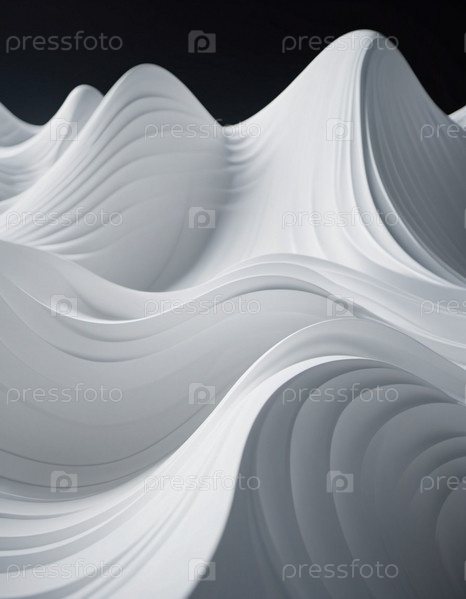 Плавные 3D-волны белого и серого цветов создают увлекательный абстрактный образец с гладкими изгибами и световыми градиентами на темном фоне, вызывая артистизм и спокойствие