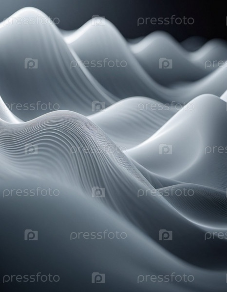 Плавные 3D-волны в цветах черного и серого создают увлекательный абстрактный образец с плавными изгибами и световыми градиентами на темном фоне, провоцируя артистизм и спокойствие