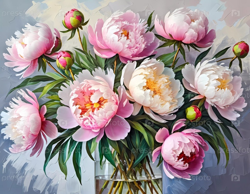 Потрясающая композиция из цветущих розовых пионов заполняет кадр, с мягкими пастельными тонами на заднем плане. Цветы демонстрируют нежные лепестки и богатые текстуры, прославляя природную элегантность. Генеративный ИИ
