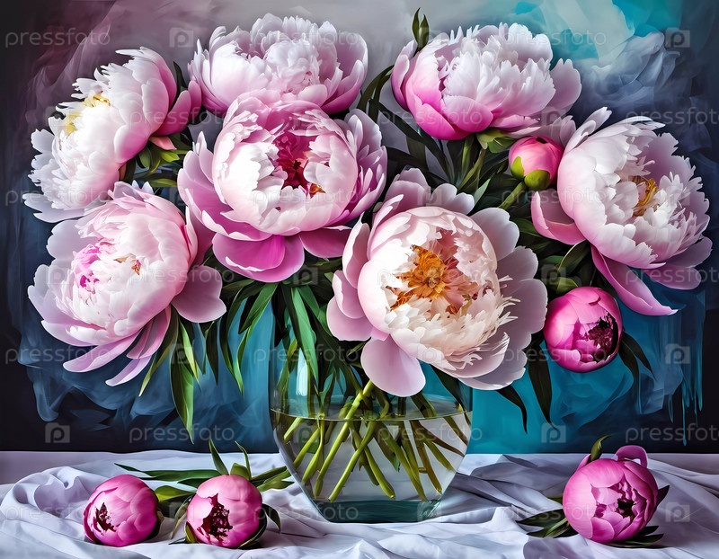 Потрясающая композиция из цветущих розовых пионов заполняет кадр, с мягкими пастельными тонами на заднем плане. Цветы демонстрируют нежные лепестки и богатые текстуры, прославляя природную элегантность. Генеративный ИИ