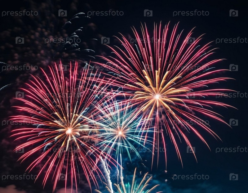 Яркое представление фейерверков освещает ночное небо. Большие вспышки света освещают темный холст выше, создавая завораживающее зрелище цвета и движения. Сгенерировано ИИ. Праздничный фон