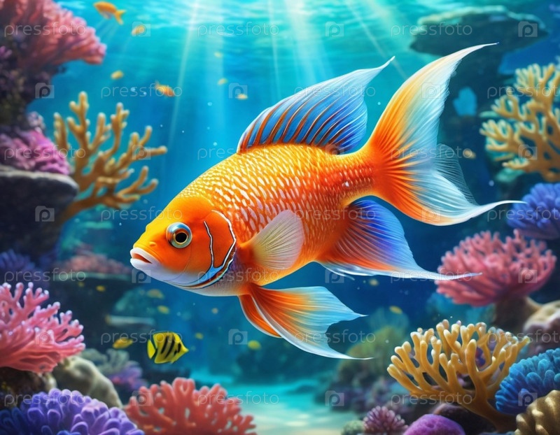 Яркие оранжево-бело-желто-синие-красные рифовые рыбы плавают через коралловый риф. Солнечные лучи проникают в морскую воду. Разнообразие животных. Экология гидросферы. Антропогенный фактор, влияющий на гибель коралловых рифов. AI