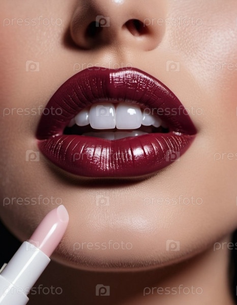 Крупный план губ женщины или молодой девушки с мерцающей коричневой, бордовой или бордовой блестящей помадой. Губы слегка приоткрыты, открывая проблеск белых зубов. Чувственность сексуальность. Сгенерировано ИИ
