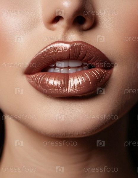 Крупный план губ женщины или молодой девушки с мерцающей коричневой, бордовой или бордовой блестящей помадой. Губы слегка приоткрыты, открывая проблеск белых зубов. Чувственность сексуальность. Сгенерировано ИИ