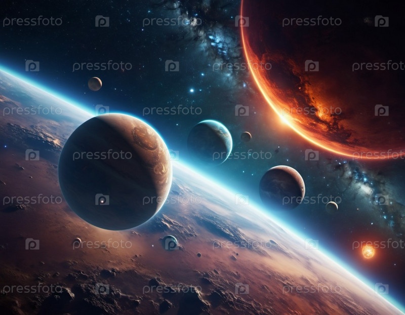 Планетарная система с несколькими планетами, большим ярко окрашенным газовым гигантом и каменистой планетой. Яркие звезды и огромное пространство темного космоса с галактикой на заднем плане. Космические просторы. Космонавтика. ИИ