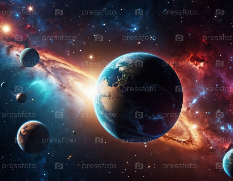 Планетарная система с несколькими планетами, большим ярко окрашенным газовым гигантом и каменистой планетой. Яркие звезды и огромное пространство темного космоса с галактикой на заднем плане. Космические просторы. Космонавтика. ИИ