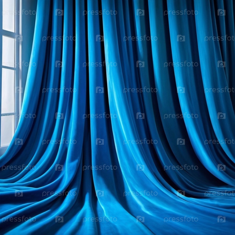 Занавес с мягкими плавными стекающими складками. Глубокий синий цвет и роскошная текстура создают драматическую и элегантную атмосферу. Декорация и дизайн интерьера. Дорогая занавес из богатой ткани. AI