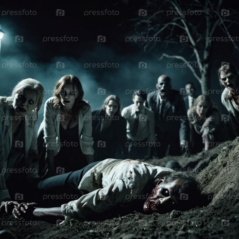 Зомби восстают из земли на тревожном кладбище. Безжизненные выражения лиц, рваная одежда раскрывают преследующее прошлое. Тусклый свет создает атмосферу ужаса. Надгробия, жуткая атмосфера, разложение и ужас. ИИ