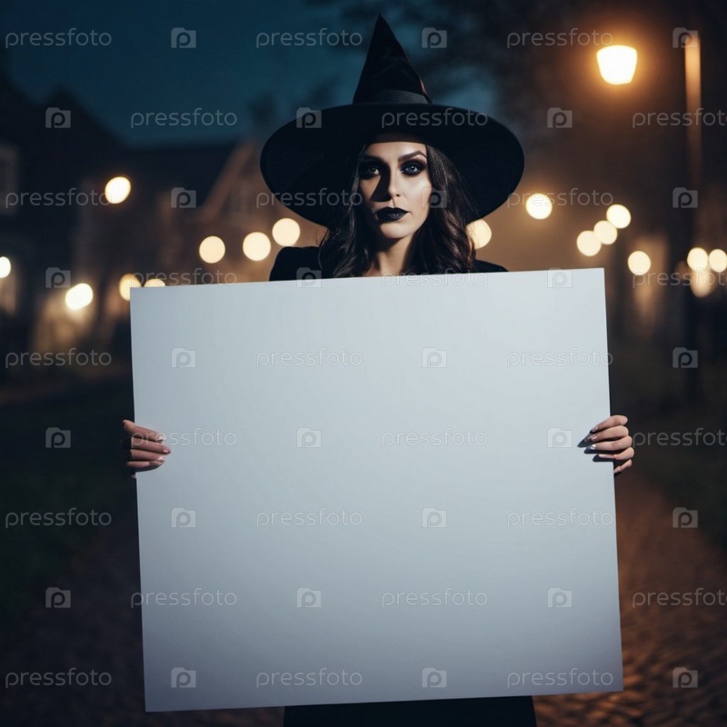 Ведьма стоит одна на улице, окутанная тайной и тьмой. Тусклый свет уличных фонарей отбрасывает теплый свет, усиливая очаровательную вечернюю атмосферу. Она держит большой пустой знак. Чары и невидимое