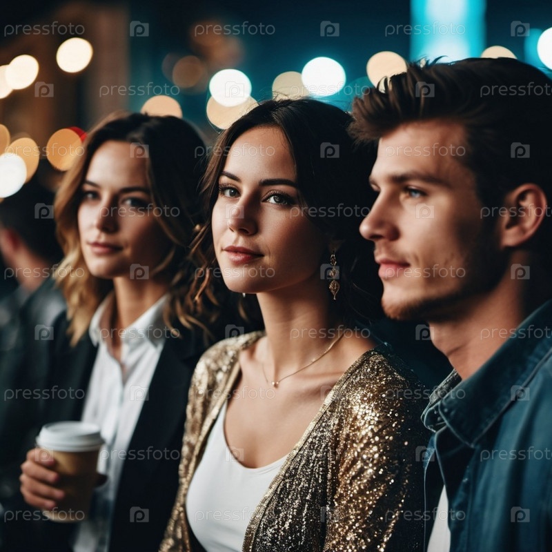 Трио друзей стоит рядом, разделяя момент оживленным вечером. Теплые городские огни создают мягкое свечение вокруг, усиливая праздничную атмосферу. Радость и связь. Мерцающие огни. Девушки и парень