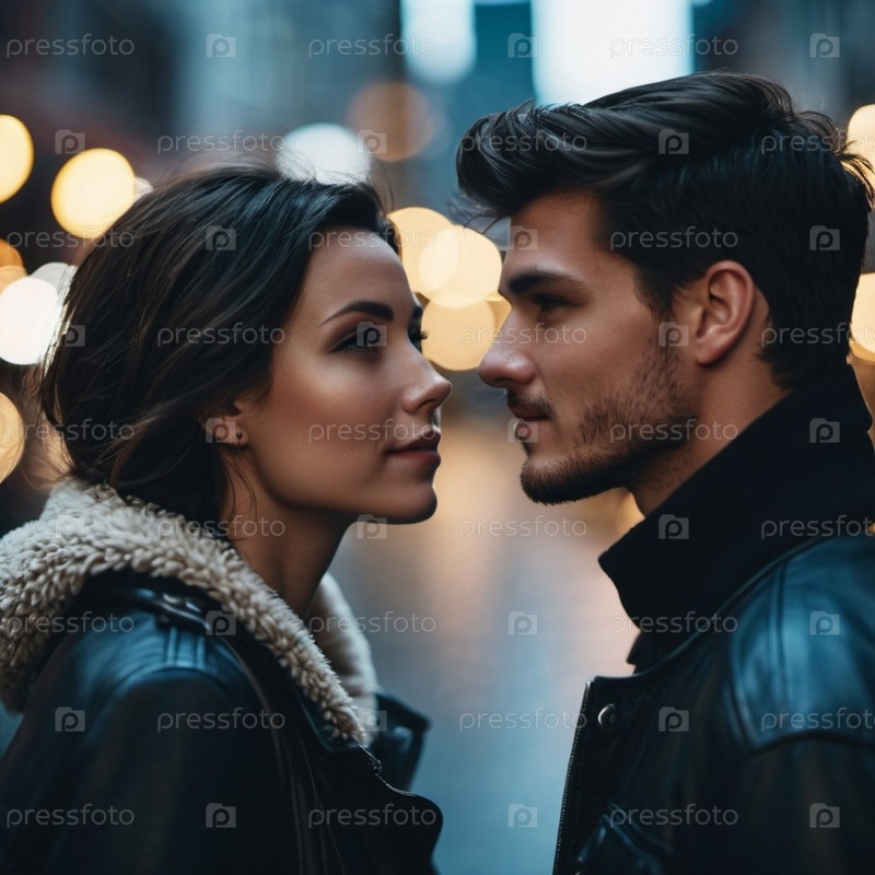 Двое друзей-любовников, мужчина и женщина, разделяют интимный момент на открытом воздухе, окруженные теплым светом, создающим волшебную атмосферу. Они смотрят друг другу в глаза, передавая чувство связи