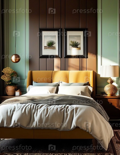 Уютная спальня в американском стиле с современным дизайном в теплой цветовой палитре и элегантным декором, идеально подходящая для отдыха и комфорта в лучах полуденного солнца. Генеративный ИИ