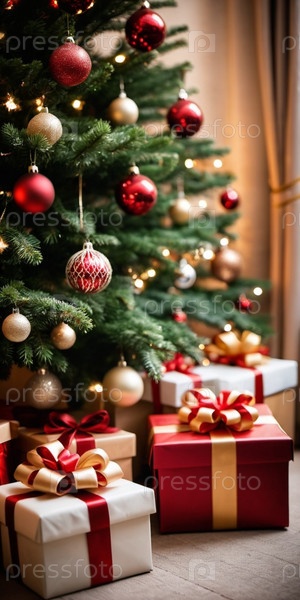 Уютная гостиная, украшенная праздничной рождественской елкой, украшенной сверкающими огнями и красочными безделушками, окруженная множеством тщательно упакованных подарочных коробок, ожидающих открытия. Искусство ИИ